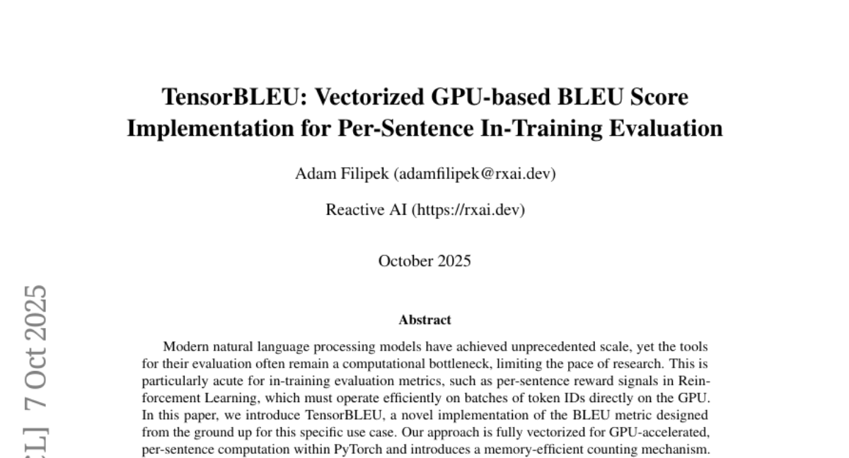 Today I published my next paper, that's introducing TensorBLEU - TensorBLEU: Vectorized GPU-based BLEU Score Implementation for Per-Sentence In-Training Evaluation (2510.05485), the optimization dedicated for Reinforcement Learning rewards based BLEU score. It achieved over 10x speed improvement over NLTK's version on small T4 GPU and even 40x improvement with A100 GPU.