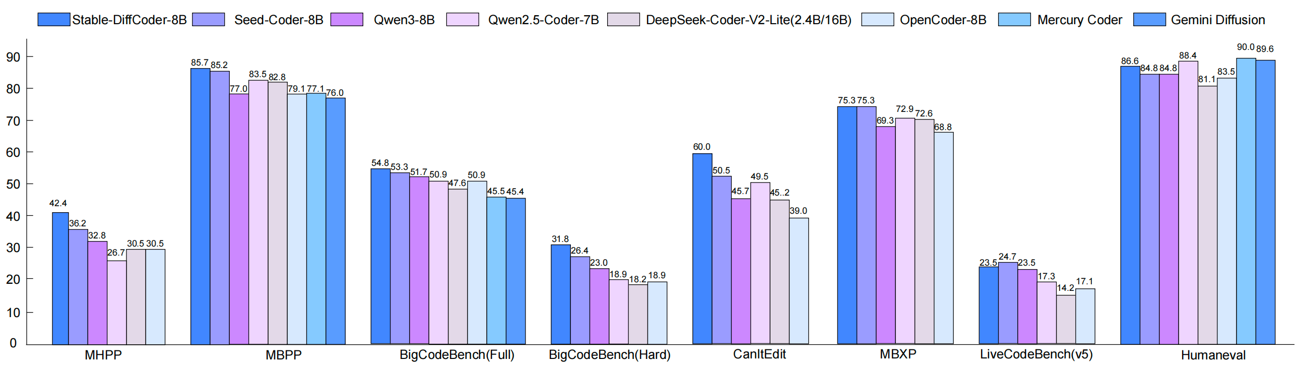 | Stable-DiffCoder-8B-Instruct | 86.6 | 85.7 | 42.4 | 54.8 | 31.8 | 23.5 |