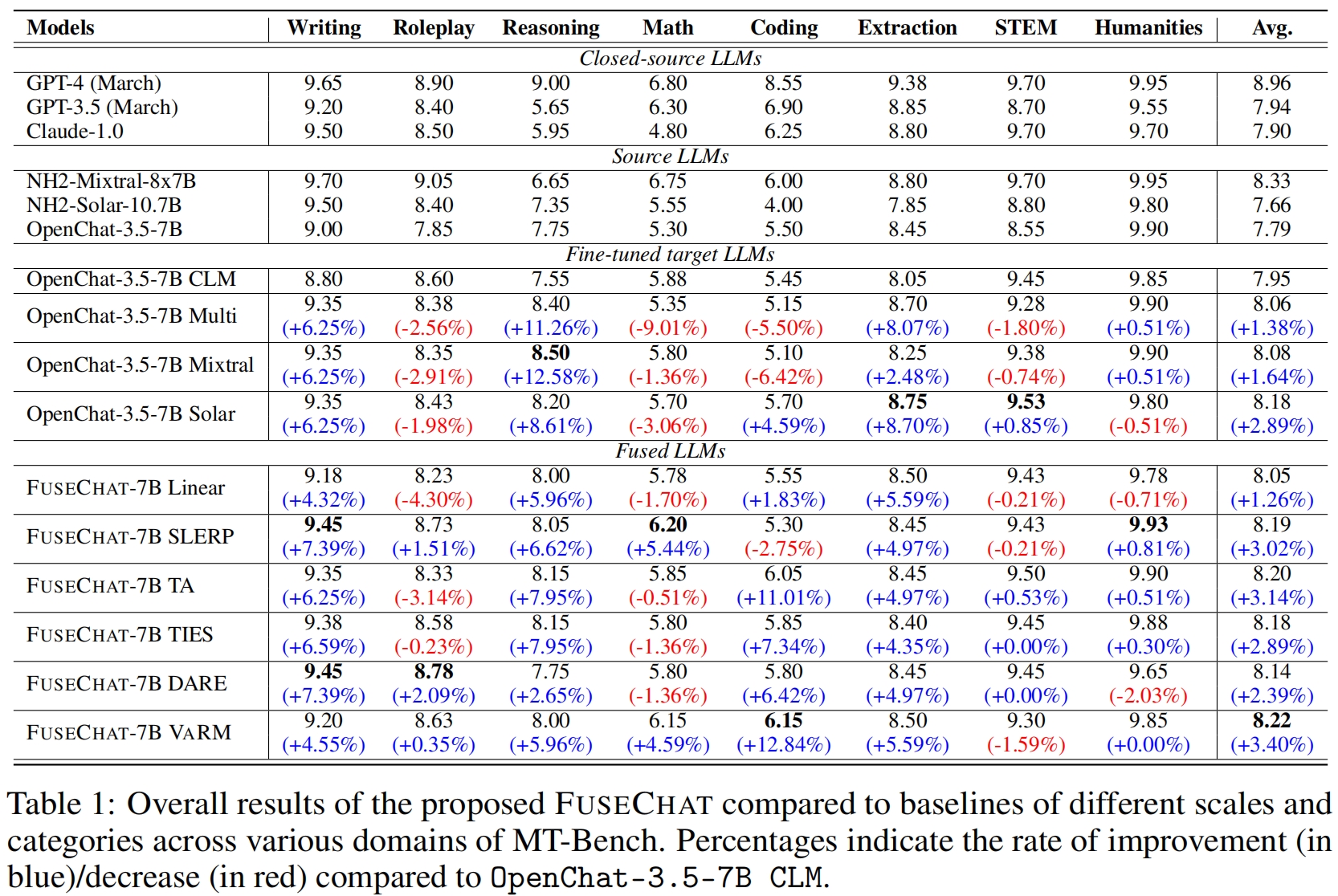 Feb 26, 2024: 🔥🔥 We release FuseChat-7B-VaRM, which is the fusion of three prominent chat LLMs with diverse architectures and scales, namely NH2-Mixtral-8x7B, NH2-Solar-10.7B, and OpenChat-3.5-7B. FuseChat-7B-VaRM achieves an average performance of 8.22 on MT-Bench, outperforming various powerful chat LLMs at 7B and 34B scales like Starling-7B and Yi-34B-Chat, even surpassing GPT-3.5 (March), Claude-2.1, and approaching Mixtral-8x7B-Instruct.