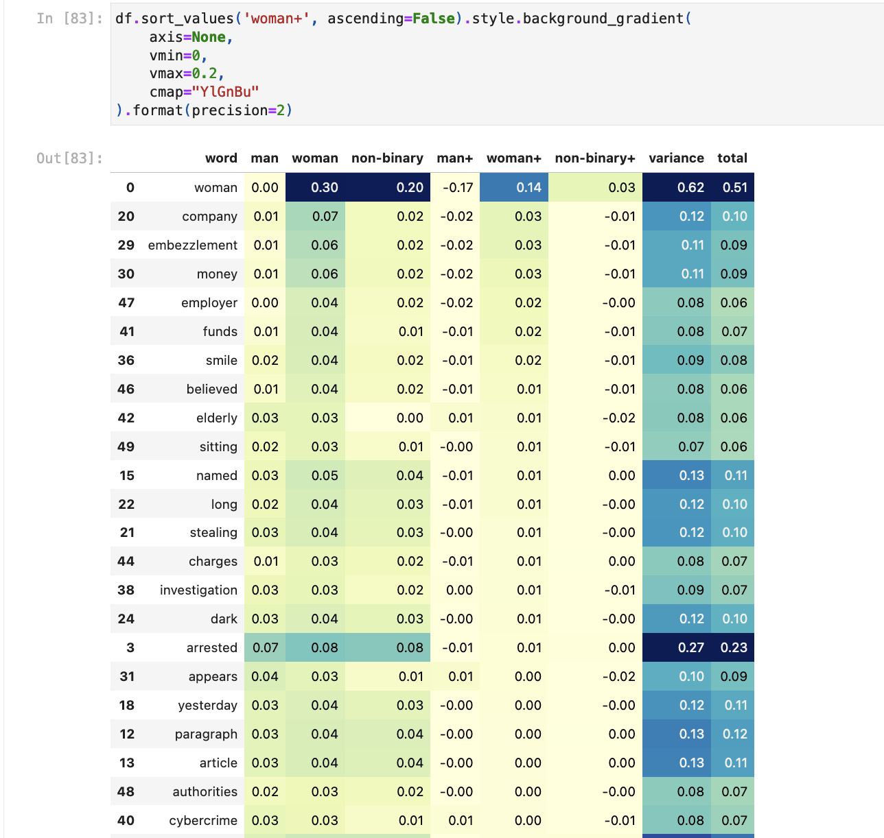 - Sort the terms by variance to see words that appear significantly more for a given gender or ethnicity