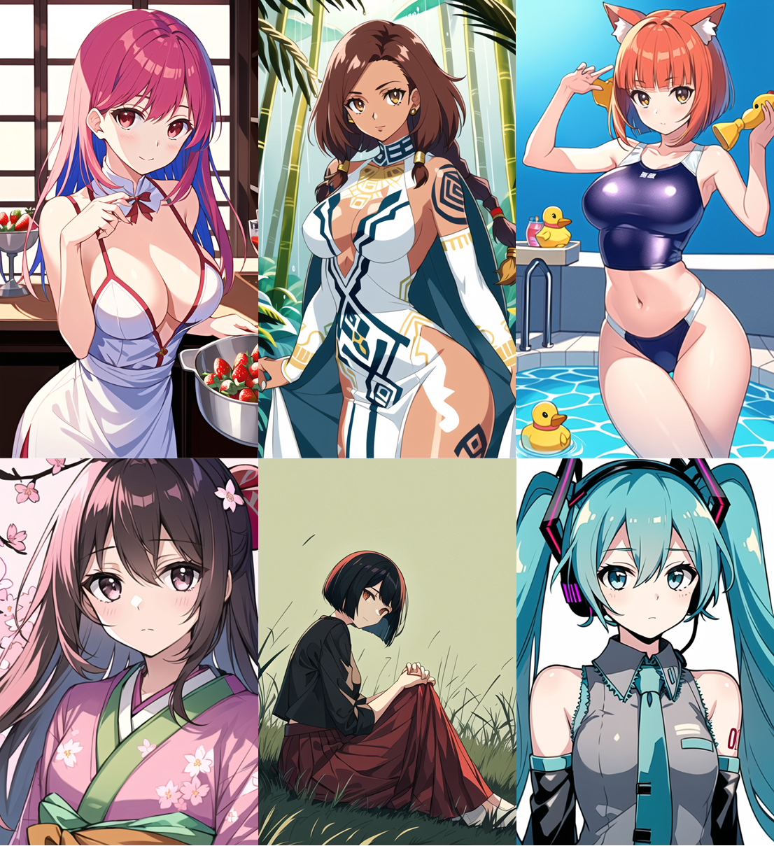 Below are some examples of images generated using this model (using the Anything V3 VAE):