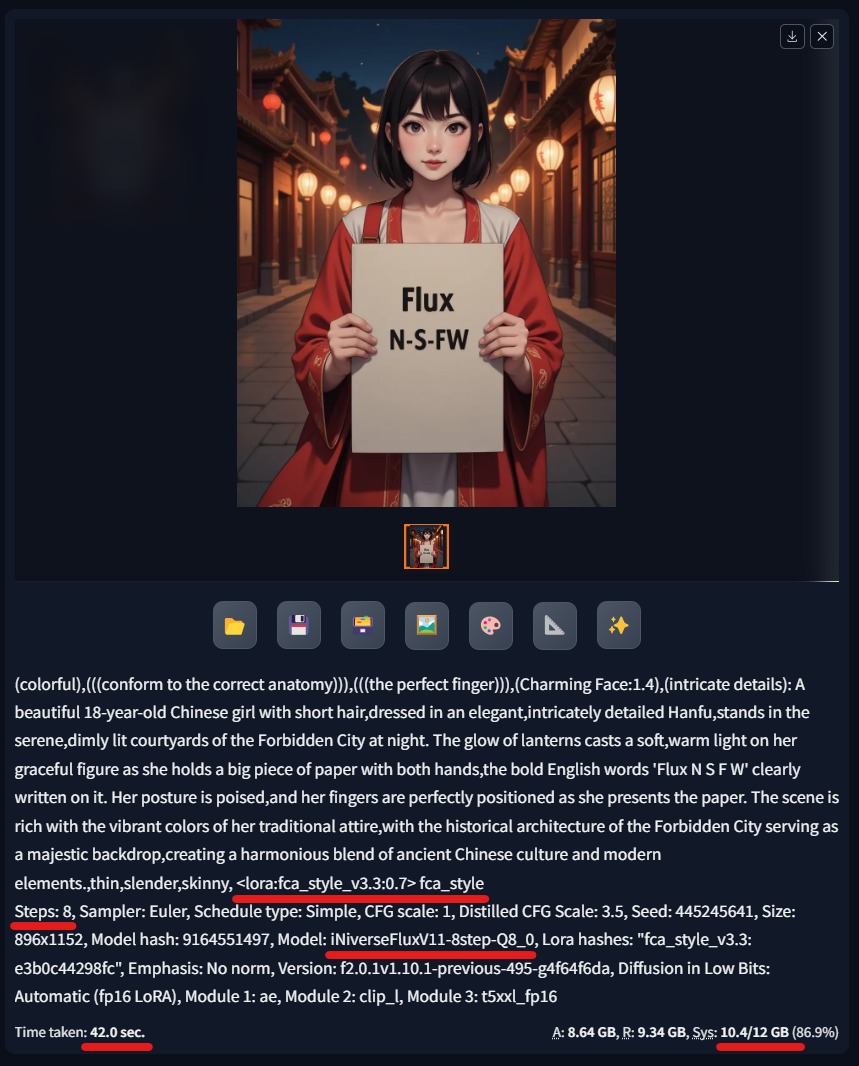 ExtractLora-FluxD-fp16.batを実行して、iNiverse から LoRA を Dim128で抽出ModelMergeLora.batを実行して、flux1-dev-hyper8.safetensors に抽出した LoRA を重み1.0でマージConvertGguf.batを実行して、マージモデルのQ8_0,Q6_K,Q4_KSに変換- Forge の
