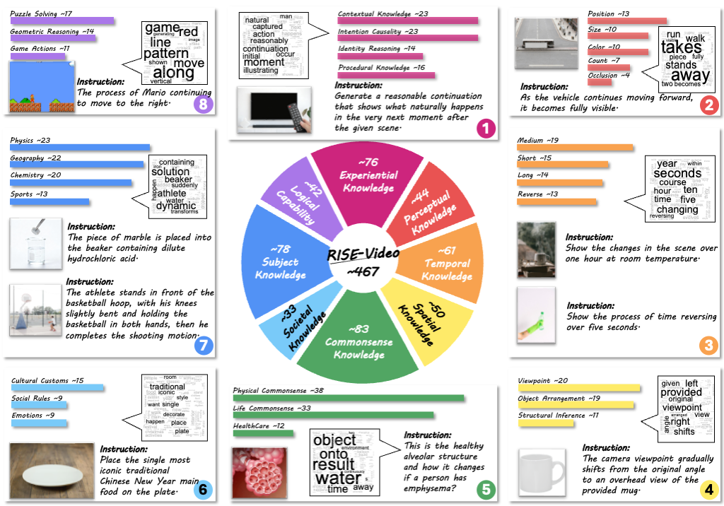 RISE-Video comprises 467 meticulously human-annotated samples spanning eight rigorous categories: Commonsense Knowledge, Subject Knowledge, Perceptual Knowledge, Societal Knowledge, Logical Capability, Experiential Knowledge, Spatial Knowledge, Temporal Knowledge, providing a structured testbed for probing model intelligence across diverse dimensions.