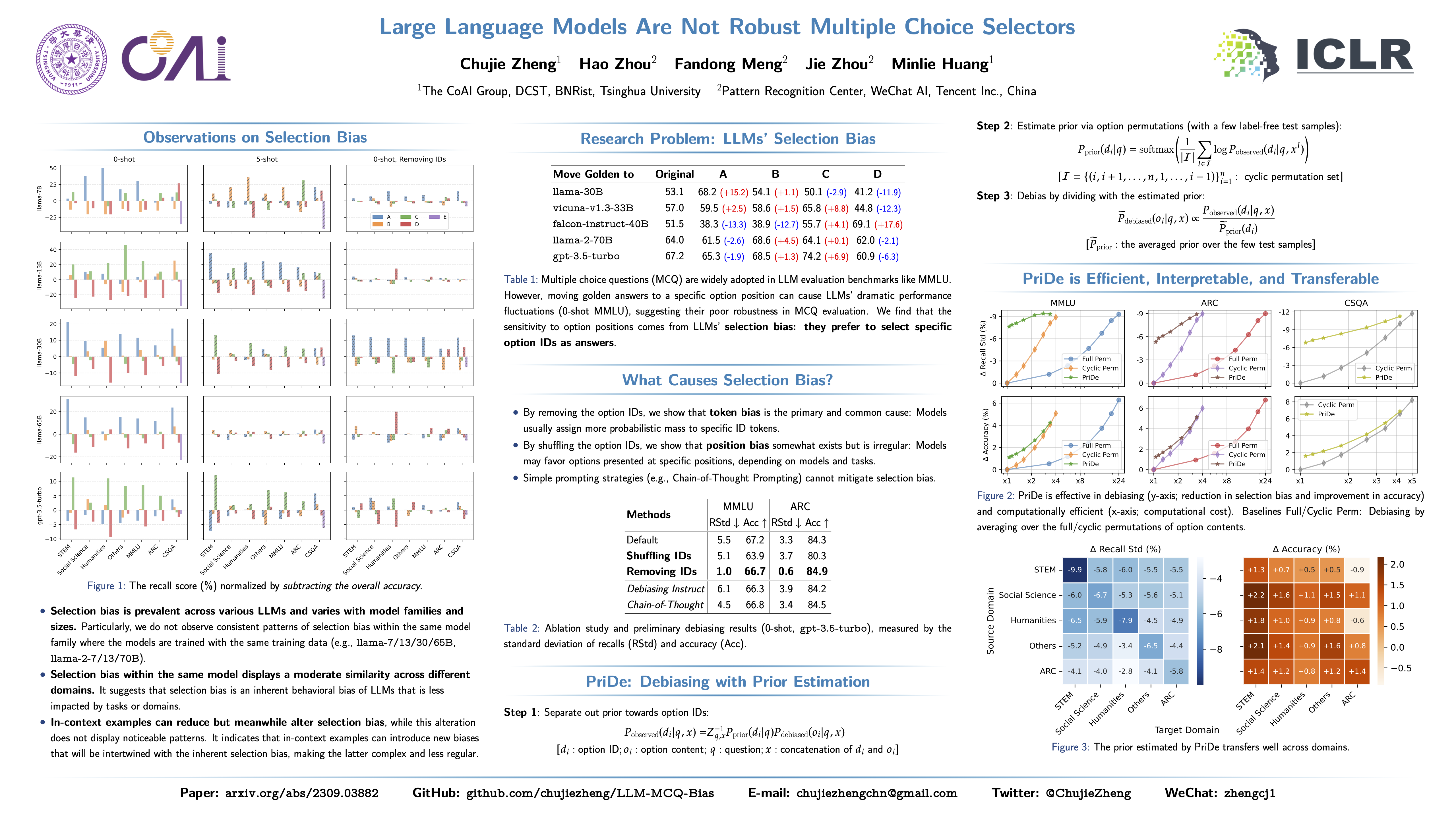 Multiple choice questions (MCQs) serve as a common yet important task format in the evaluation of large language models (LLMs). This work shows that modern LLMs are vulnerable to option position changes in MCQs due to their inherent “selection bias”, namely, they prefer to select specific option IDs as answers (like “Option A”). Through extensive empirical analyses with 20 LLMs on three benchmarks, we pinpoint that this behavioral bias primarily stems from LLMs’ token bias, where the model a priori assigns more probabilistic mass to specific option ID tokens (e.g., A/B/C/D) when predicting answers from the option IDs. To mitigate selection bias, we propose a label-free, inference-time debiasing method, called PriDe, which separates the model’s prior bias for option IDs from the overall prediction distribution. PriDe first estimates the prior by permutating option contents on a small number of test samples, and then applies the estimated prior to debias the remaining samples. We demonstrate that it achieves interpretable and transferable debiasing with high computational efficiency. We hope this work can draw broader research attention to the bias and robustness of modern LLMs.