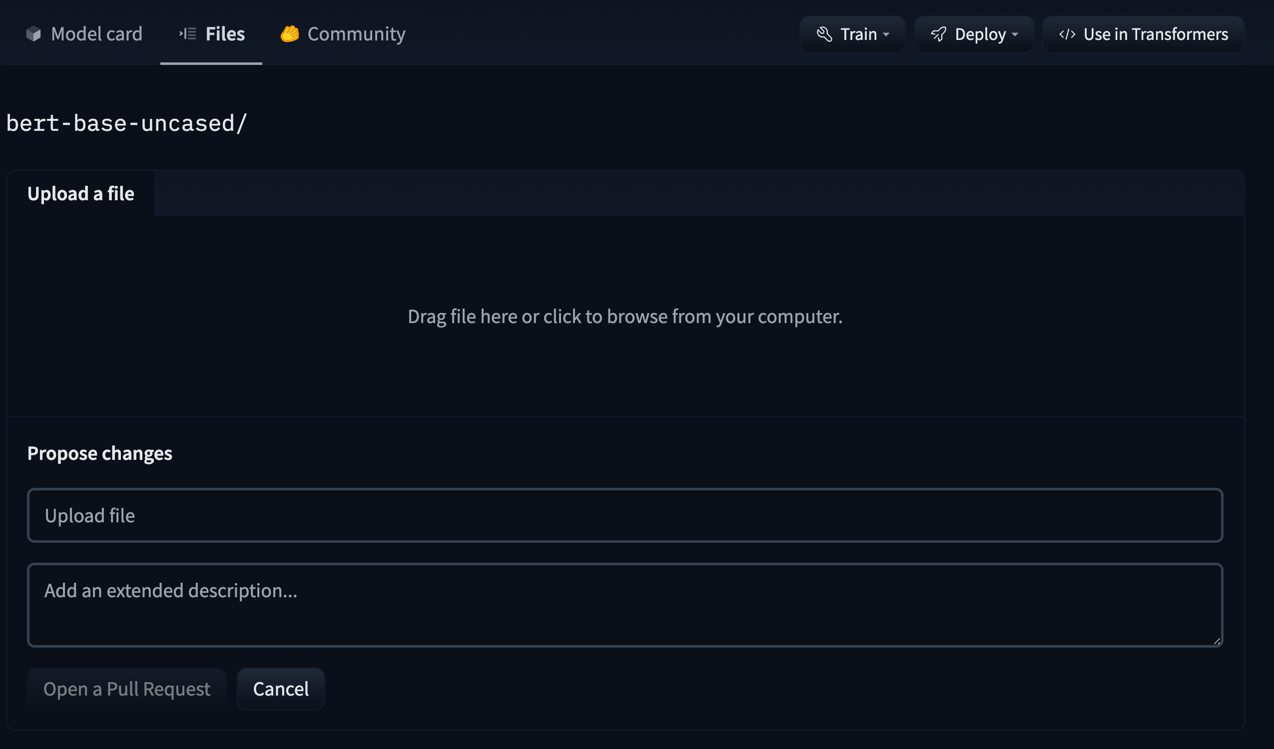 - In the “Files and versions” tab, select “Add File” and specify “Upload File”: