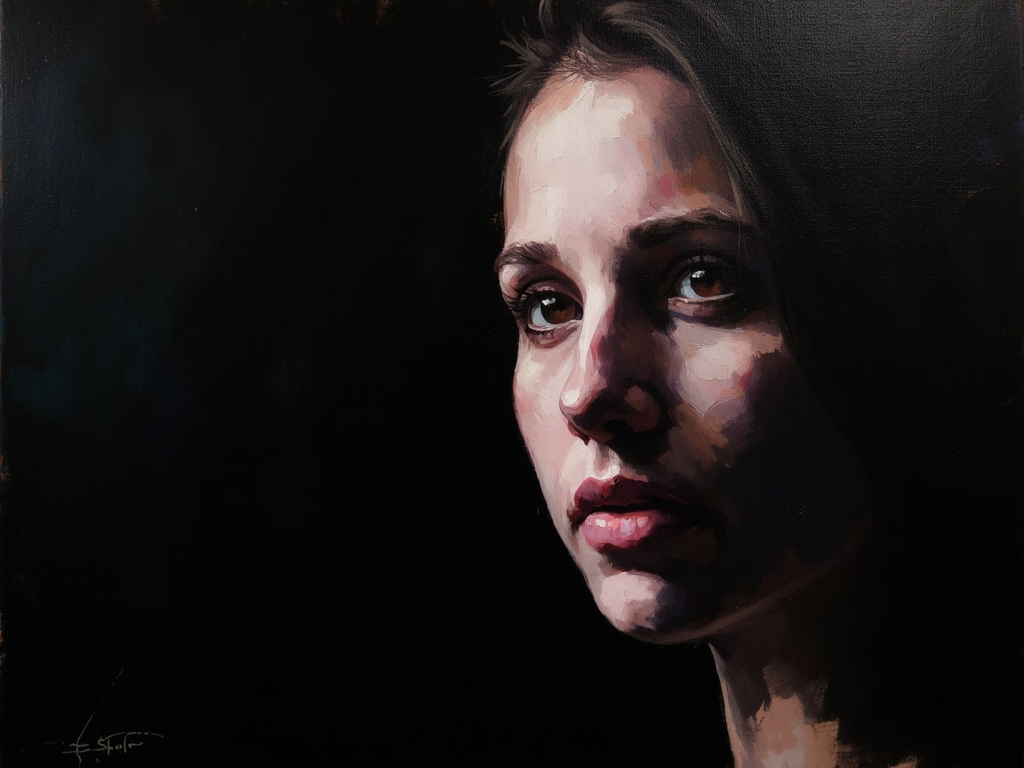 - XPRSSV, expressive painting, lady in shadow, dark tones, calm looking