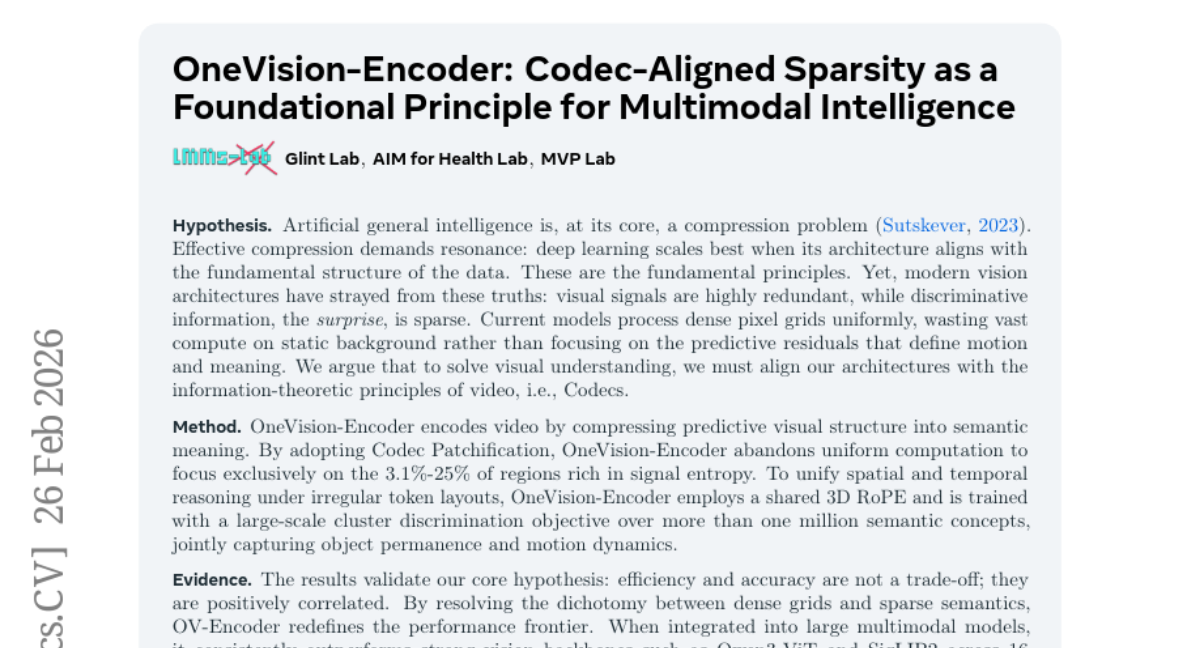 [2025-12] 🤞🤞 See the real world in motion | Presenting OneVision Encoder: Codec-Aligned Sparsity as a Foundational Principle for Multimodal Intelligence.