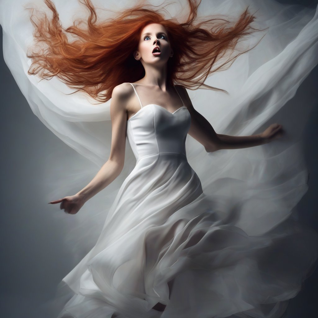 Beautiful long red haired young lady with sudden unseen problem. She is surprised. (Vogue)